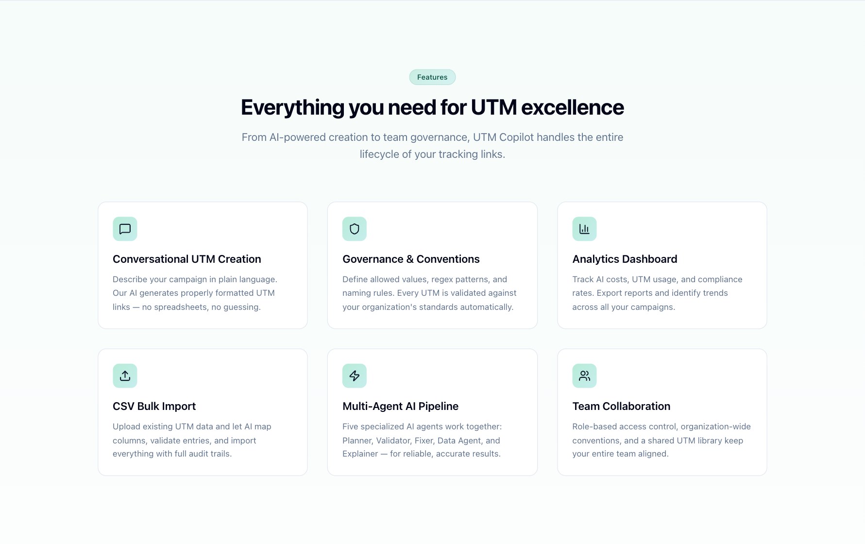 UTM Copilot puts governance at the point of creation. You describe the campaign in plain language, a multi-agent AI pipeline drafts the UTM, validates it against your organization's rules, fixes anything non-compliant, and explains exactly what it did before you approve. Every link lives in a searchable library with version history, tags, and QR codes — and the whole thing is auditable.